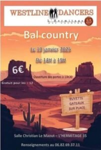 Le Dimanche 19 Janvier 2025, Après Midi Bal Country des *Westline Dancers*, de 14h00 à 19h00, Salle Christian le Maout, à L’Hermitage (35), Ille et Vilaine.