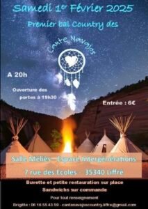Le Samedi 1er Février 2025, 1er Bal Country des *Cante Navajos*, à 20h00, Salle Méliès, Espace Intergénérations, 7, rue des Ecoles, à Liffré (35340), Ille et Vilaine.