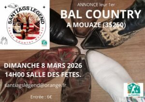 Le Dimanche 08 Mars 2026, Après Midi 1er Bal Country à 14h00, chez *Santiags Legend Danse Country*, Salle des Fetes de Mouaze (35250), Ille et Vilaine .