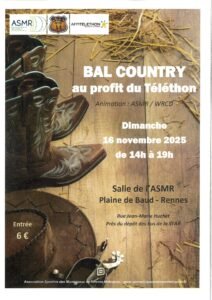 Le Dimanche 16 Novembre 2025, Après MidiBal Country pour le Téléthon, de 14h00 à 19h00, Salle de L’ASMR, Plaine de Baud, rue Jean Marie Huchet, à Rennes (35), Ille et Vilaine.