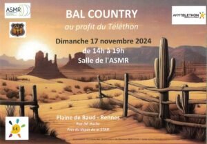 Le Dimanche 17 Novembre 2024, Après Midi Bal Country au profit du Téléthon, de 14h00 à 19h00, Salle de L’ASMR, Plaine de Baud, rue JM Huche, près du Dépot de la Star, à Renn