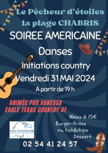 Le Vendredi 31 Mai 2024, Soirée Americaine à 19h00, animée par *Vanessa*, avec Initiations Danse Country, Plage de Chabris (36), Indre.