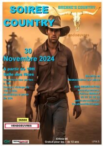 Le Samedi 30 Novembre 2024, Soirée Country chez *Brenne’s Country*, à partir de 19h00, Salle des Fetes de Vendoeuvres (36500), Indre.