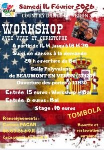 Le Samedi 14 Février 2026, Journée Country Dance, chez *Country Dance Veron*, avec Workshop de *Vivie et Christophe*, de 14h00 à 18h30 et Bal Country à 20h00, Salle Polyvalente de Beaumont en Véron (