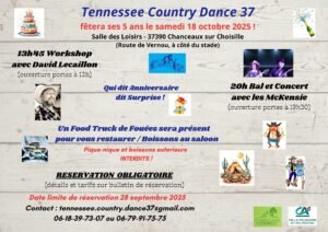 Le Samedi 18 Octobre 2025, Journée Country à partir de 13h00, chez *Tennessee Country Dance 37*, qui Fetera ses 05 ans, avec Workshop de *David Lecaillon* et Bal Concert animé par les *McKensie*, Salle des Loisirs de Chanceaux sur Choisille (37390), Indre et L
