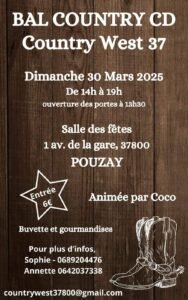 Le Dimanche 30 Mars 2025, Après Midi Bal Country chez *Country West 37*, de 14h00 à 19h00, Salle des Fetes, 01, Avenue de la Gare, à Pouzay (37800), Indre et Loire.