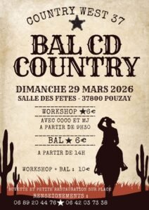 Le Dimanche 29 Mars 2026,Journée Country cd des *Country West 37*, avec *Coco et MJ *, à partir de 09h30, Salle des Fêtes de Pouzay (37800), Indre et Loire.