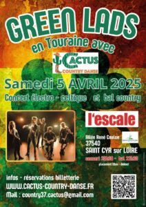Le Samedi 05 Avril 2025, Bal Country des *Cactus Country Dance*, avec un Concert Electro , celtique de *Green Lads* à 20h30, à L’Escale, Allée René Coulon, à St Cyr sur Loire (