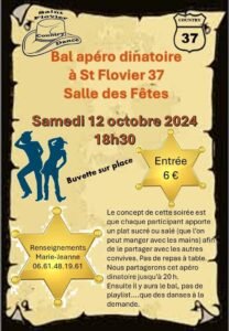 Le Samedi 12 Octobre 2024, Bal Apéro Dinatoire Country, à 18h30, Salle des Fetes de St Flovier (37), Indre et Loire.
