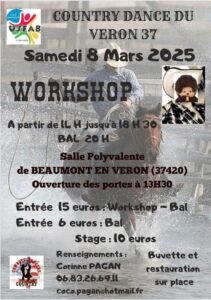 Le Samedi 08 Mars 2025, Journée Country à partir de 14h00, avec Workshop et Bal Country à 20h00, Salle Polyvalente de Beaumont en Veron (37420), Indre et Loire.