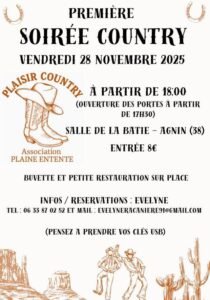 Le Vendredi 28 Novembre 2025, 1ère Soirée Country chez *Plaisir Country*, à 18h00 Salle de La Batie, à Agnin (38) Isère.