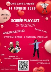 Le Samedi 14 Février 2026, Journée Line Dance des *Cold Land’s Angels*, à partir de 13h30, avec Workshop *Aurémi Danse et Anthony Iannelo*, et Soirée à 18h00, au Gymnase Paul Croce, à A
