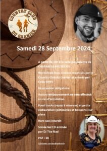 Le Samedi 28 Septembre 2024, Journée Country Line Dance organisée par *Le Country Club du Granier*, à partir de 14h00, avec Workshops de *Colin Ghys*,