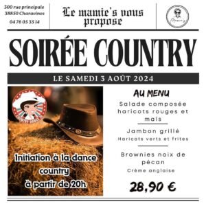 Le Samedi 03 Aout 2024, *Le Mamie’s* vous Propose une *Soirée Country à 20h00, , avec Initiation, 300, rue Principale, à Charavines (38850), Isère .