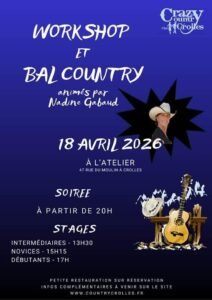 Le Samedi 18 Avril 2026, Journée Country à partir de 13h30, avec Workshop et Bal Country animés par *Nadine Gabaud* et Soirée Stages, à L’Atelier , 47 rue du Moulin à Crolles (38) Isè