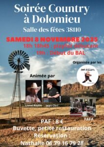 Le Samedi 08 Novembre 2025, Soirée Country à 19h00, animée par *Lionel Rajon* et *Jean Chri*, chez les*JMC Friend’s*, Salle des Fetes de Dolomieu (38110), Isère.