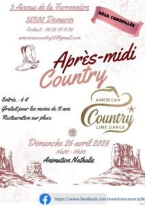Le Dimanche 26 Avril 2026, Après Midi Country chez *American Country Line Dance*, de 14h00 à 19h00, 3 Avenue de la Ferronnière, à Domarin (38300), Isère.