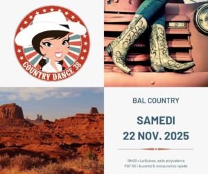Le Samedi 22 Novembre 2025, Bal Country à 19h00, chez *Country Dance 38*, Salle Polyvalente de La Buisse (38) Isère.