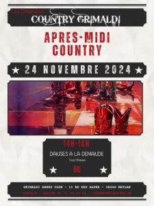 Le Dimanche 24 Novembre 2024, Après Midi Bal Country chez *Country Grimaldi*, de 14h00 à 18h00, Grimaldi Danse Club, 11, Boulevard des Alpes, à Meylan (38240), Isère.
