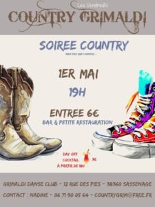 Le Vendredi 1er Mai 2026, Soirée Country chez *Country Grimaldi*, à 19h00, 12 rue des Pies, à Sassenage(38360), Isère.