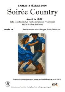 Le Samedi 14 Février 2026, Soirée Country à partir de 18h00, Salle Jean Fournet, 1 rue Commandant L’Herminier, à St Clair du Rhône (38370), Isère.