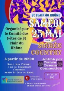 Le Samedi 25 Mai 2024, Soirée Country à partir de 19h00, Salle Jean Fournet, 01, rue du Commandant L’Herminier, à St Clair du Rhone (38370), Isère.