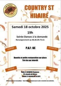 Le Samedi 18 Octobre 2025, Soirée Country Danses à la demande, chez *Country St Hilaire*, à 19h00, Salle A.Jacquier, agaymnase, 115, Chemin de Bièvre, à S