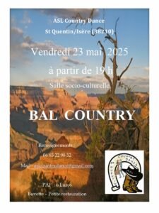 Le Vendredi 23 Mai 2025, Bal Country chez *ASL Country Dance*, à 19h00, Salle Socio Culturelle de St Quentin (38210), Isère.