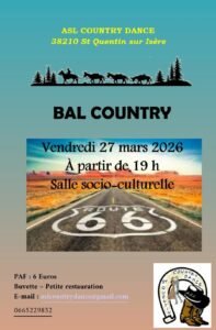 Le Vendredi 27 Mars 2026, Bal Country à 19h00, chez *ASL Country Dance*, Salle Socio Culturelle de St Quentin sur Isère (38210), Isère.