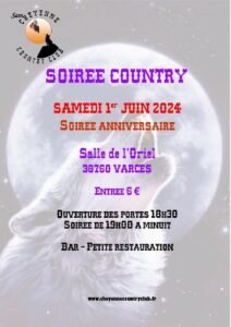Le Samedi 1er Juin 2024, Soirée Country de 19h00 à Minuit, Salle de L’Oriel, à Varces (38760), Isère.