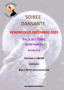 Le Vendredi 05 Décembre 2025, Soirée Country des *Cheyenne Counry Club*, à partir de 18h30, Salle de L’Oriel, à Varces (38760), Isère.