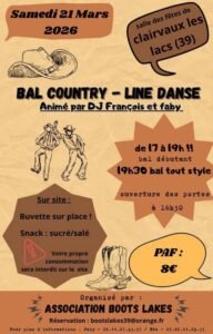 Le Samedi 21 Mars 2026, Bal Country Line Dance animé par *DJ François et Faby*, à partir de 17h00, chez *Boots Lakes*, Salle des Fêtes de Clairvaux les L