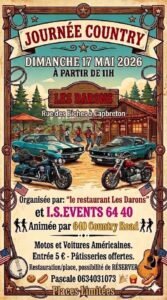 Le Dimanche 17 Mai 2026, Journée Country organisée par *Le Restaurant Les Darons*, et *I S Events 6440*, animée par *640 Country Road*, à partir de 11h00, avec Motos et Voitures Americaines, rue des Biches, à Cap