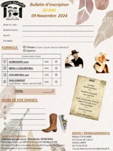 Le Samedi 09 Novembre 2024, Journée Line Dance des *Coyotes Dancers Montois*, qui Feteront leurs 20 ans avec Stages de *Guillaume Richard* de 14h00 à 18h00 et Bal Concert animé par *MiMuZik*, à 21h00, 3280, Auberge Landaise, à Mont de Marsan (40),