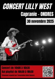 Le Dimanche 30 Novembre 2025, Après Midi Concert Country de *Lilly West*, chez *Rebel Dancers*, de 14h00 à 16h30, Capranie, à Ondres (40) , Landes.