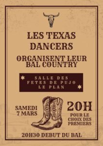 Le Samedi 07 Mars 2026, Bal Country des *Texas Dancers*, à 20h30, Salle des Fêtes de Pujo le Plan (40), Landes.