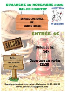 Le Dimanche 30 Novembre 2025, Après Midi Bal Country cd chez *Country Dance en Vendomois*, à 14h00 Espace Culturel de Lunay (41360), Loir et Cher.