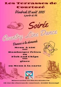 Le Vendredi 22 Aout 2025, Soirée Country Line Dance à 19h00, aux Terrasses de Courtozé, 10 rue du Chateau de Courtozé, à Mazangé (41100), Loir et Cher.