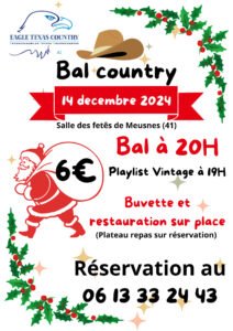 Le Samedi 14 Décembre 2024, Bal Country de Noel, chez *Eagles Texas Country*, à 20h00, Salle des Fetes de Meusnes (41), Loir et Cher.
