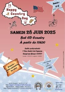 Le Samedi 28 Juin 2025, Bal Country cd des *Happy Country Day*, à partir de 18h30, Salle Polyvalente, 07, rue André du Vigneau, à Sargé sur Braye (41170), Loir et Cher.