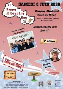 Le Samedi 06 Juin 2026, Journée Country des *Happy Country Day 72 .41.*, avec Initiations , Bal cd et Concert des *Texas Sidestep*, au Camping Municipal , chemin de L’aulnay, à Sargé sur B