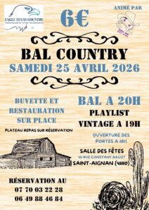 Le Samedi 25 Avril 2026,Bal Country à 20h00, chez *Eagle Texas Country*, Salle des Fêtes, 45 rue Constant Ragot, à St Aignan (41110), Loir et Cher.