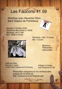 Le Samedi 04 Octobre 2025, Journée Country de 14h00 à 00h00, avec Workshop de *Séverine Fillion* et Bal , Salle des Fetes , rue de la Mairie à St Sulpice (