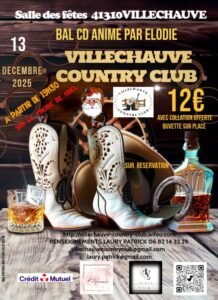 Le Samedi 13 Décembre 2025, Bal Country cd animé par *Elodie* , à 19h30, chez *Villeneuve Country Club*, Salle des Fetes de Villechauve (41310), Loir et Cher.