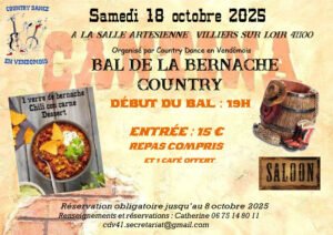 Le Samedi 18 Octobre 2025, Bal Country de La Bernache, chez Country Dance en Vendomois*, à 19h00, Salle Artesienne, à Villiers sur Loir (41100), Loir et Cher.