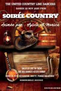Le Samedi 22 Novembre 2025, Soirée Country animée par *Sylvie et Monica*, à partir de 17h30, Salle La Loge du Trève, rue des Sources, à Farnay (42320), Loire.