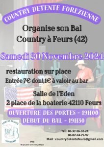 Le Samedi 30 Novembre 2024, Bal Country chez *Country Detente Forezienne*, à 19h30, Salle de L’Eden, 02, Place de la Boaterie, à Feurs (42110), Loire.