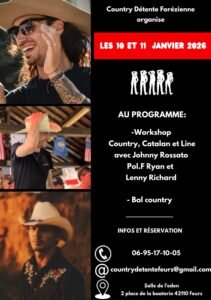 Les 10 et 11 Janvier 2026, Week End Country chez *Country Détente Forézienne *, avec Workshop Country Catalan et Line de *Johnny Rossato* , *Pol F Ryan* et *Lenny Richard*, Salle de L’Eden, 2 Place de la Boo