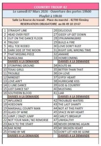 Le Samedi 07 Mars 2026, Soirée Country des *Country Troupe 42*, à 19h30, Salle de la Bourse du Travail, Place du Marché, à Firminy (42700), Loire.