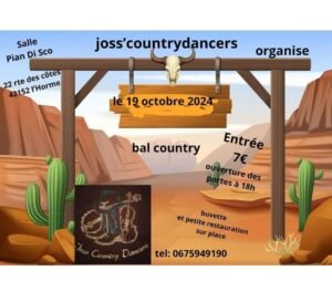 Le Samedi 19 Octobre 2024, Bal Country chez *Joss’Countrydancers*, à partir de 18h00, Salle *Pian Di Sco*, 22, Route des Cotes, à L’Horme (42152), Loire.